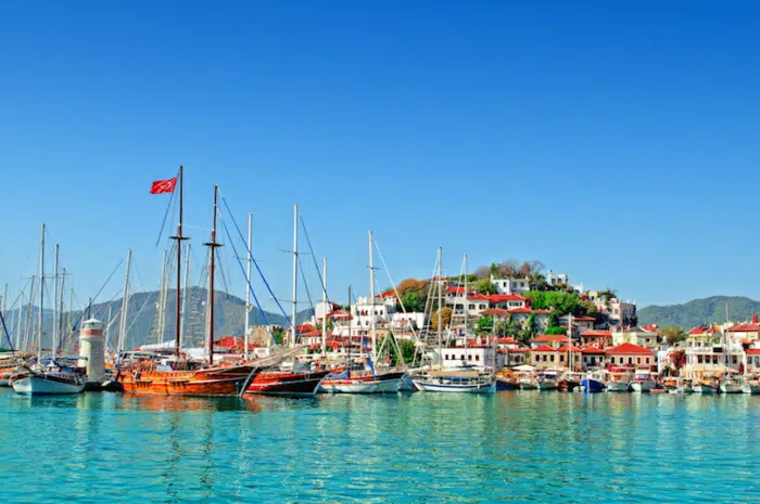 Marmaris, l'une des stations balnéaires les plus populaires de Turquie, offre un cadre parfait composé de montagnes couvertes de pins, de plages de sable blanc, d'eaux turquoise et d'architecture historique. Situé le long de la Riviera turque, dans le sud-ouest de la Turquie, ce magnifique port de croisière est un paradis touristique offrant des possibilités touristiques exceptionnelles, des sports nautiques, des restaurants fantastiques et une vie nocturne animée.