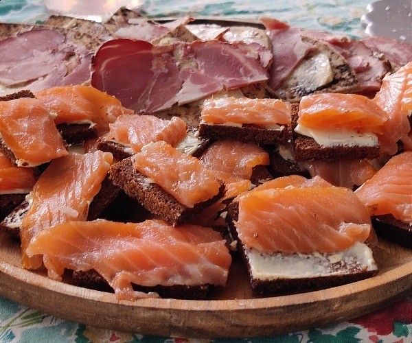 Nous nous sommes sentis comme chez nous et avons été encouragés à essayer nous-mêmes quelques entrées, notamment de délicieux agneau fumé et du saumon fumé au beurre de rúgbrauð. Ce pain de seigle est traditionnellement fabriqué sous terre, généralement en plaçant la pâte dans des récipients tels que des briques de lait, puis dans un sol chauffé géothermiquement pendant 24 heures avant qu'elle ne soit prête.