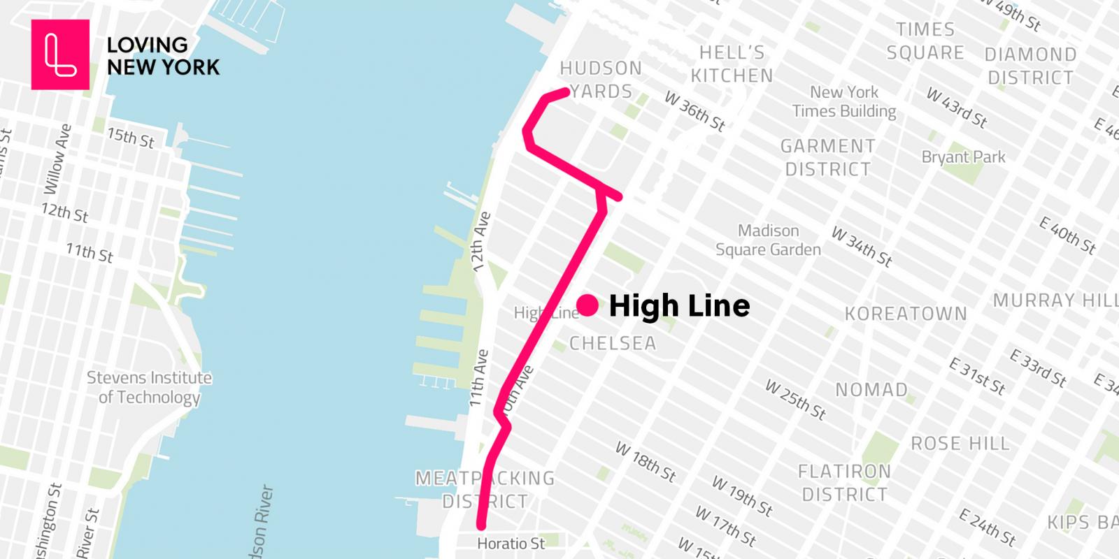 Le parc a ses origines dans le Meatpacking District et s'étend de Gansevoort Street, trois pâtés de maisons en dessous de la 14e rue, en passant par Chelsea jusqu'à l'extrémité nord du West Side Yard sur la 34e rue, près du Javits Center. La High Line est accessible aux fauteuils roulants.