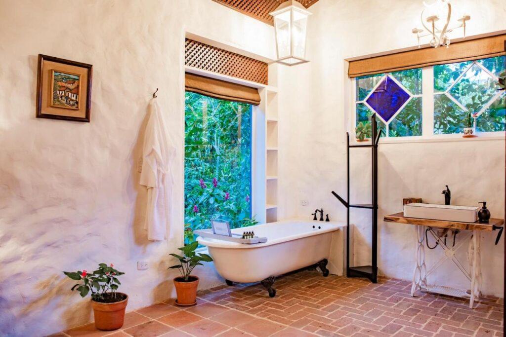 Axées sur la durabilité et l'hospitalité chaleureuse, les chambres, villas et suites de Finca Rosa Blanca présentent des peintures murales peintes à la main représentant la culture du café au Costa Rica, des meubles en bois fabriqués à la main et une végétation luxuriante devant chaque fenêtre. La ferme est située dans une zone boisée de la province d'Heredia, et certaines suites offrent une vue imprenable sur les collines vallonnées qui s'étendent sur des kilomètres. Vous trouverez également une piscine, un spa et des bains à remous attenants, ajoutant à l'ambiance relaxante de Finca Rosa Blanca.