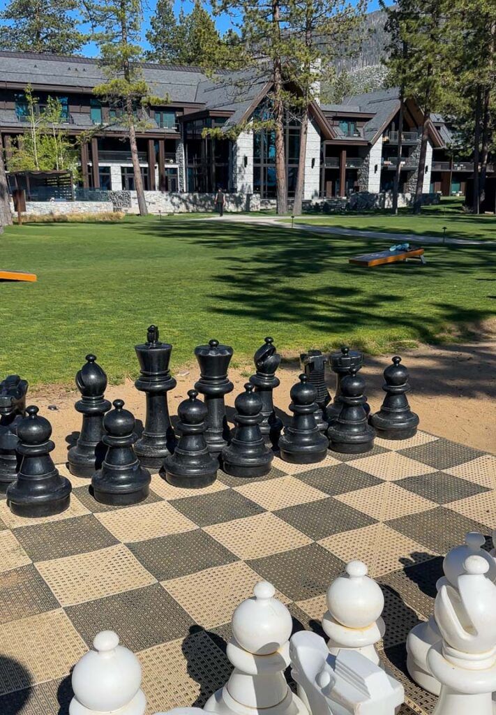 Le domaine d'Edgewood est impressionnant. Le complexe est entouré de pins et se trouve directement sur la plage du lac Tahoe, ce qui est en fait rare pour la plupart des hébergements. Il y a presque toujours une route à traverser ou un parking à gérer lors d'une visite à Tahoe, donc avoir une plage privée directement sur la propriété est un énorme avantage. Pour ceux qui aiment un peu d'activité, de nombreux sports nautiques sont disponibles, du paddleboard au kayak. Il y a également des jouets de sable pour les enfants et un immense échiquier.