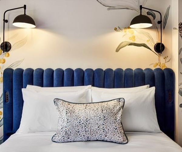 Les intérieurs de l'hôtel de huit étages s'inspirent des textures et des teintes locales, notamment le bleu du port de Sydney de ses luxueuses têtes de lit en velours, le verre cannelé inspiré des formes du pont Pyrmont en face et un luminaire sculptural de 200 pièces dans le hall. émule les lumières tachetées. Lumière du soleil à travers les feuilles d'eucalyptus.